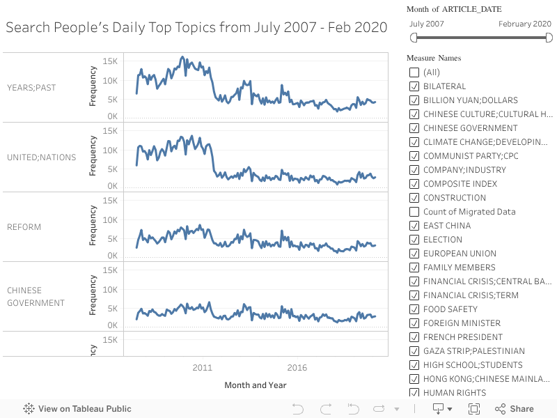 Please see below for an interactive chart highlighting the top topics in the People’s Daily from July 2007 to February 2020. The most popular topics during the time period are at the top; least popular at the bottom.