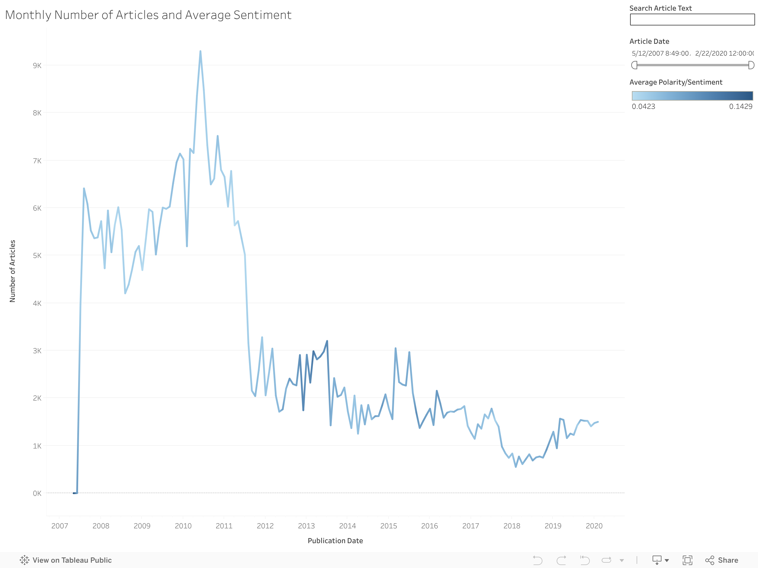 Search our database of China’s People’s Daily English articles posted from 29 June 2007 to 22 Feb 2020, a total of just over 475,000 articles. Use the ‘Search Article Text’ box to enter your search term, hit return, and then see how many articles per month contain that term, along with the average monthly sentiment of articles with the term. The darker the blue, the more positive the sentiment. Sentiment data created using Google; visualization created using Tableau.