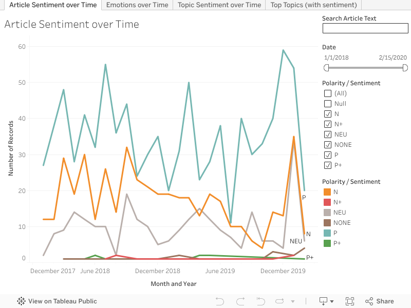 Sentiment and topics based on all 1,600 articles found. Topic and sentiment data created using MeaningCloud; visualization created using Tableau. N+ is very negative sentiment, N is negative, NEU is neutral, P is positive, and P+ is very positive.