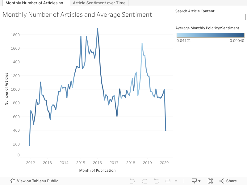 Search our database of Iran’s Islamic Republic News Agency (IRNA) database of English content posted from 22 December 2011 to 15 February 2020, a total of just over 102,000 articles. Use the ‘Search Article Text’ box to enter your search term, hit return, and then see how many articles per month contain that term, along with the average monthly sentiment of articles with the term. The darker the blue, the more positive the sentiment. Sentiment data created using Google; visualization created using Tableau.